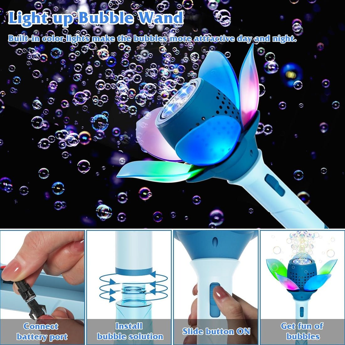 - Features a beautiful lotus flower shape with 10 bubble-making holes and enchanting LED lights that create a mesmerising display during play